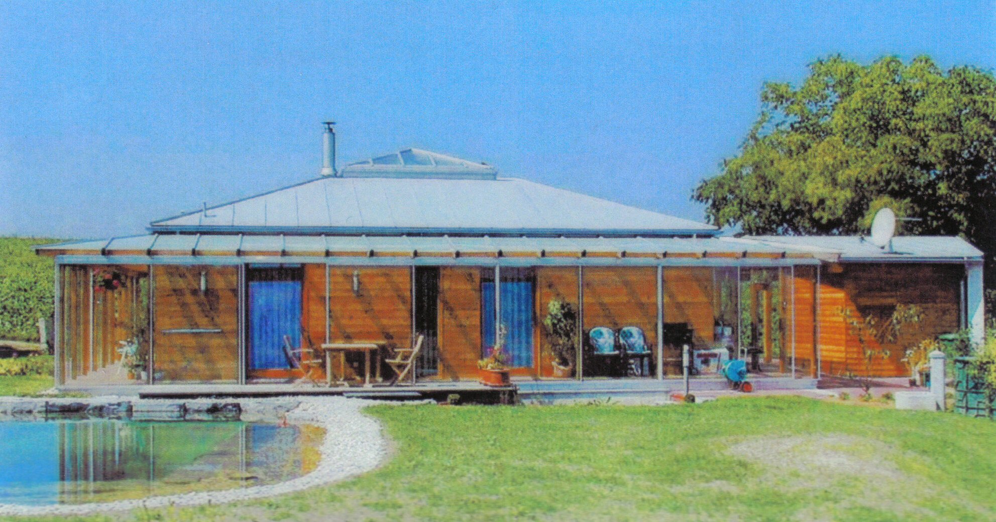 Die Glaselemete des rund um das Haus laufenden Wintergartens werden aufgeschoben, schon hat man rund um das Haus eine Veranda. Freier Zugang für Licht, Luft und Sonne.