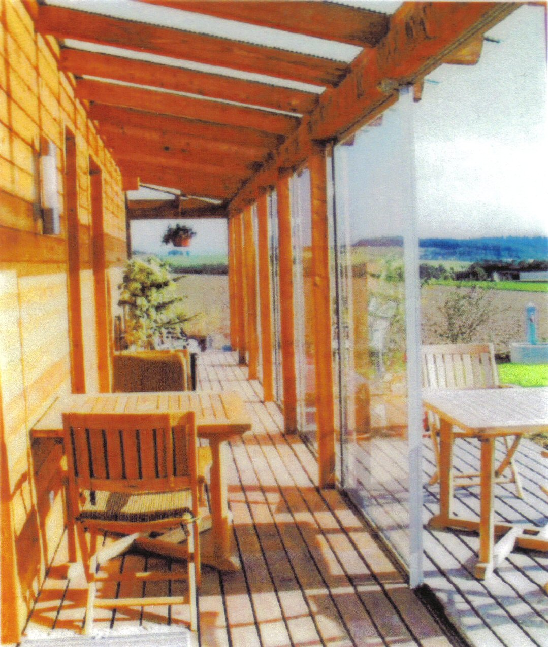 | Veranda wird zum WintergartenDie Glaselemete des rund um das Haus laufenden Wintergartens werden aufgeschoben, schon hat man rund um das Haus eine Veranda. Freier Zugang für Licht, Luft und Sonne. |