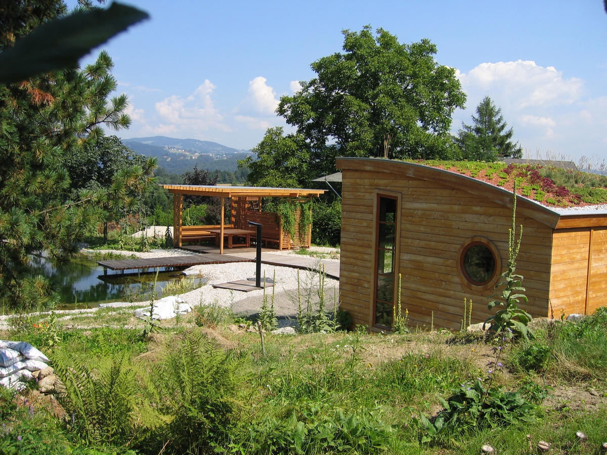 Wochenendhaus mit Schwimmteich und Pergula Laube im Grüngürtel von Linz als idealer Ort zum Entspannen. Erholung vor Ort statt Urlaubsstress.