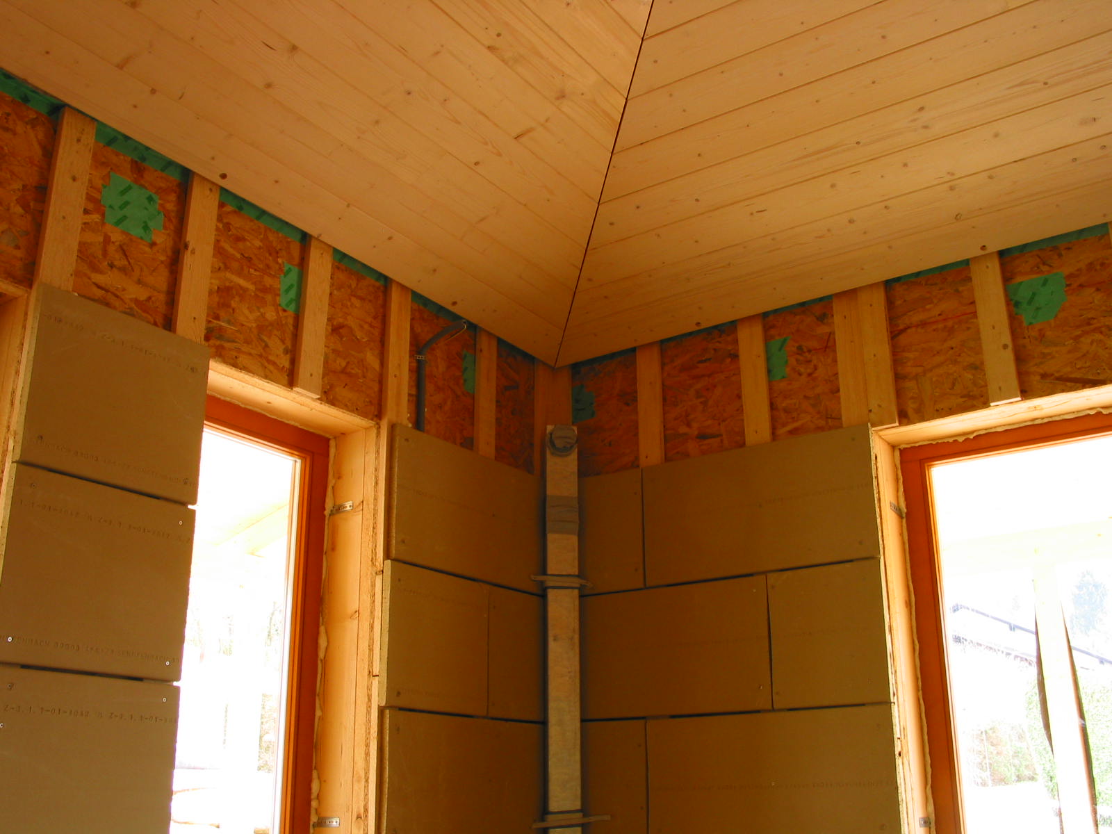 Der Wandaufbau aller Innenwandteile wurde hier in Form vom trockenen ungebrannten Lehmbauplatten gewählt mit einer ergänzenden dünnen Lehmputzschicht als ebene Oberfläche. Wärmedämmung Dach