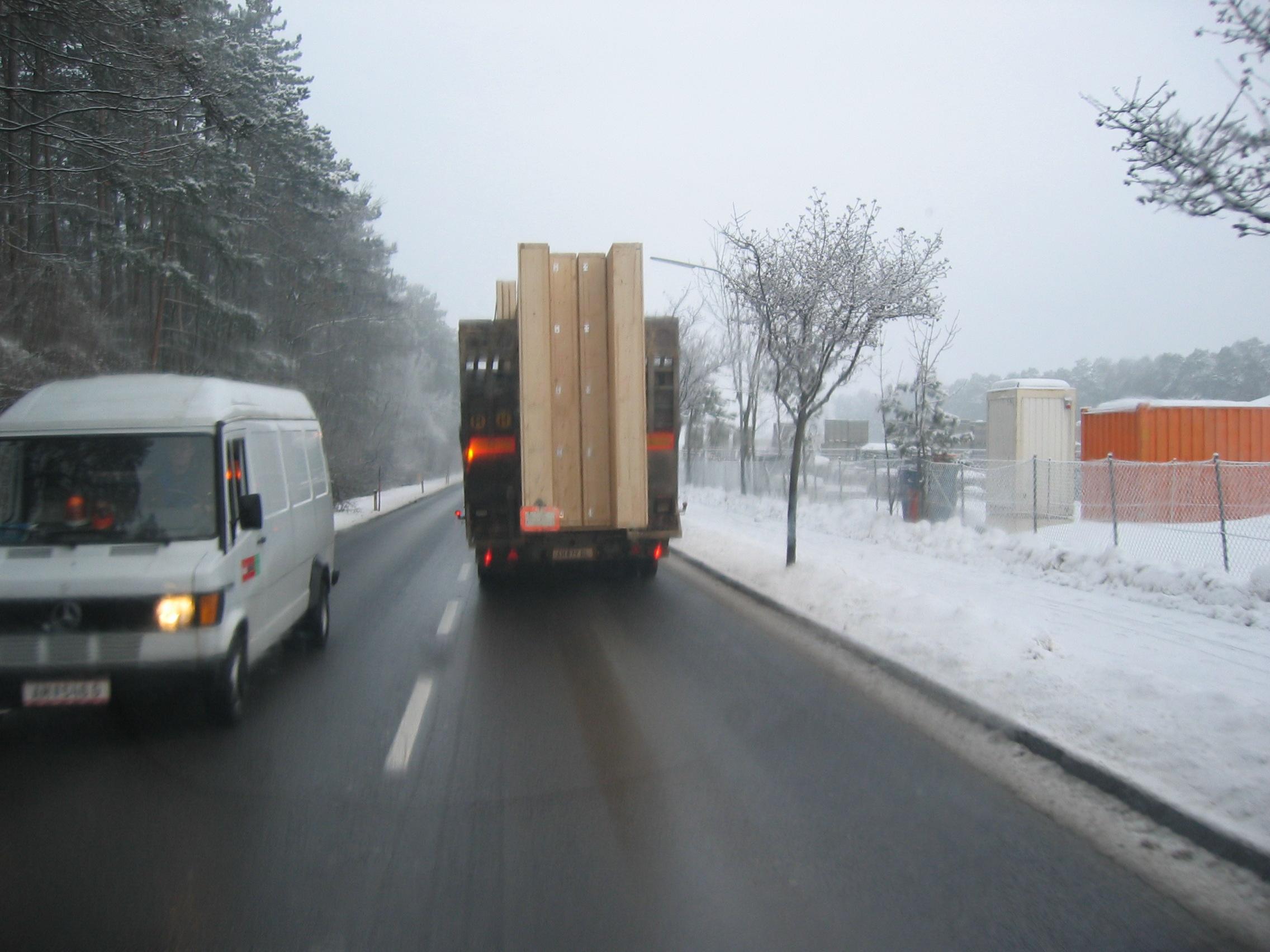 Die fertigen Hausteile in einer bisher für den Hausbau unüblichen Jahreszeit auf dem Weg zur Baustelle. Das Holz ist vorgetrocknet und hat keine Probleme mit kurzfristiger Feuchte. Vorbereitung der Kellerdecke
